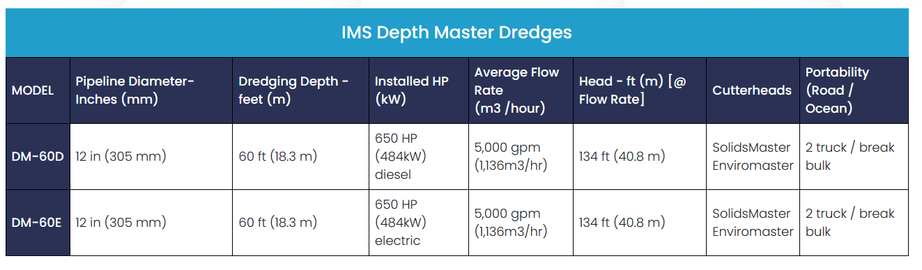 The Depth Master is a cost-effective solution for navigation channel maintenance at ports. It is self-propelled and easily transportable. The maximum 305mm discharge line makes the discharge manageable when dewatering space is limited. Additionally, the GPS system (optional) allows the operator to manoeuvre the dredge cutter into the existing channel design to precisely remove sediment. These cuts can be tracked against the pre-dredging survey to ensure the contract has been completed within scope. The IMS Depth Master can maintain deep channels from 12m to 18m in depth.