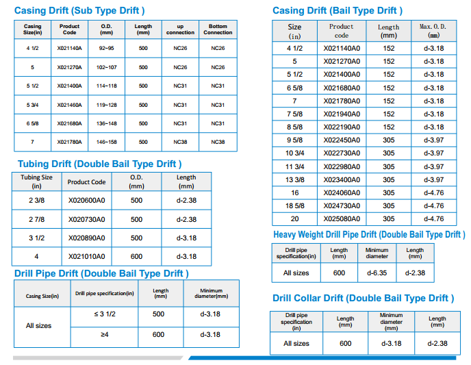 Drift is a simple and common tool to measure the bore size of casing, tubing, drill pipe and other pipes. It is used to check whether inside diameter of all kinds of pipes are complied with standard, and to determine the max. inside diameter to be drifted after deformation. The drift is thus granted as a necessary tool in workover operation.