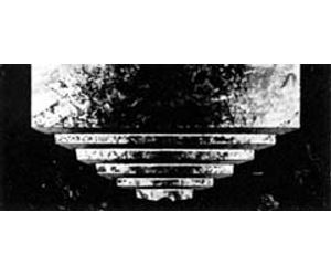 Cutaway sketch of step drilling pattern as cut by Blue Demon BD and BDA Drill Heads. Lead bit drills 1½" hole. It is followed by other bits that shear and ream final hole size. Bits are set at an angle to assure fastest penetration without scaping, chipping or gouging