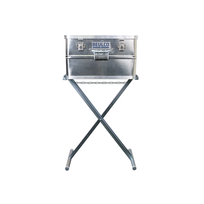 Expanding the drinking water connection box with the specially adapted support frame enables ergonomic work during setup and operation of the water extraction point. The support frame comes with a work surface and can be securely positioned on solid and preferably flat ground using ground anchors or similar. Transport is also easy by folding the frame.