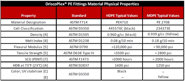 DriscoPlex MDPE and HDPE Molded Fittings are available to meet your needs in compliance with ASTM D2513, D3261, F2897 and AWWA C901 and C906 product standards. Made in the USA and produced from high quality MDPE and HDPE material, DriscoPlex Fittings are manufactured from PE 2708 and NSF-61/Annex G approved PE 4710 resin as listed in PPI-TR4.