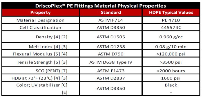 DriscoPlex HDPE Molded Fittings are available to meet your needs in compliance with ASTM D2513, D3261, F2897 and AWWA C901 and C906 product standards. Made in the USA and produced from high quality HDPE material, DriscoPlex Fittings are manufactured from NSF-61/Annex G approved PE 4710 resin as listed in PPI-TR4.