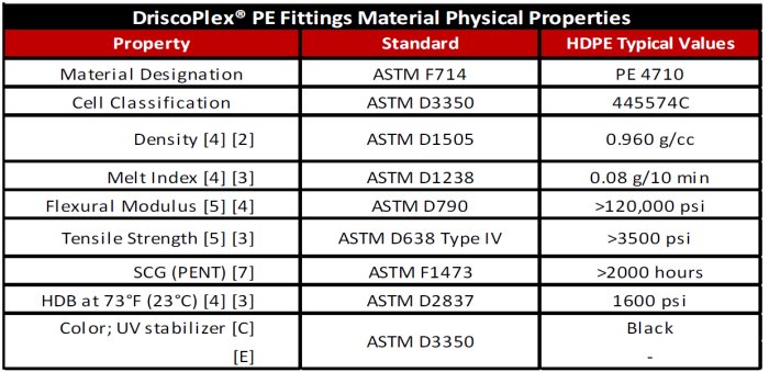 DriscoPlex HDPE Molded Fittings are available to meet your needs in compliance with ASTM D3261 and AWWA C901 and C906 product standards. Made in the USA and produced from high quality HDPE material, DriscoPlex Fittings are manufactured from NSF-61 approved PE 4710 resin as listed in PPI-TR4.