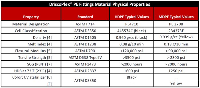 DriscoPlex MDPE and HDPE Molded Fittings are available to meet your needs in compliance with ASTM D2513, D2683, F2897 and AWWA C901 and C906 product standards. Made in the USA and produced from high quality MDPE and HDPE material, DriscoPlex Fittings are manufactured from PE 2708 and NSF-61/Annex G approved PE 4710 resin as listed in PPI-TR4.