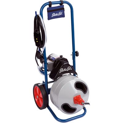 Cleans 1-1/4” – 3” diameter lines up to 100 ft. while running 1/2″ dia. galvanized aircraft wire inner core cable. Built-in drum shaft slip clutch. Upright frame on large 10” wheels with folding handle. Rear bar shields motor and allows for two position operation. Steel guide tube/inner drum. 1/2” x 75 ft. cable standard.