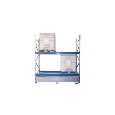Article number: 18535. Suitable for: 4x IBC, 16x 200L drum, 4x chemical pallet or 6x euro pallet. External dimensions WxDxH: approx. 2930 x 1100 x 3550 mm. Box width: approx. 2700 mm. Drip tray BxDxH: approx. 2650 x 1300 x 493 mm. Contents collection box: approx. 1100 litres. Underride height of drip tray: approx. 100 mm. Weight rack / bin: approx. 153 kg / approx. 107 kg.