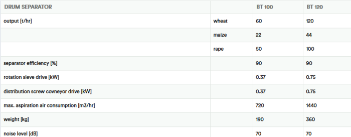 Drum separator PBT is designed for preliminary grain cleaning. It founds usage especially in postharvest lines and silos. PBT precleans cereals using a rotary screen. The product is dosed to the distribution screw, which, with the help of adjustable vanes and dampers, spreads product over the entire rotary screen. Using the rotary screen, the product is sorted into two portions. Overflow from the rotary screen are impurities larger than the mesh and fall swipe overflow. Slump rotary screen is sorting product that falls across the width of the swipe fall into screen separator or aspiration screen.