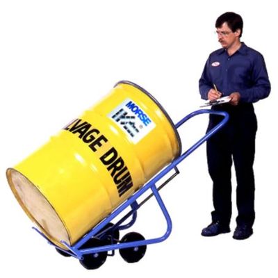 Drum Truck - Morse 160M Multi-Purpose 4 Wheel with Spark Resistant Parts - Ergonomic Drum Trucks Move and Dispense a Heavy Drum with Ease. Morse 4-Wheel Drum Trucks make it easy to move a heavy drum. Theare are simple to load, maneuver and carry the full weight of a drum on four 8" polyolefin wheels. There is no need to support or balance the truck. You can move a drum on and off pallets and even stand alone in horizontal position to dispense. It`s U-Shaped handle is more narrow than a 55 gallon drum. When you`re done using the truck, it stands upright for storage. Spark Resistant parts are intended to reduce the possibility of mechanical sparks as a possible source of ignition. They are not a substitue for grounding and bonding for preventing static electircity discharges.