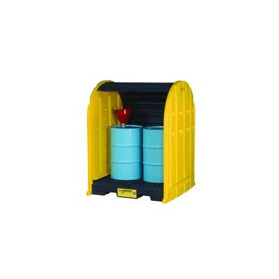 Safe, Compliant Eco-Friendly Storage for Drums. EcoPolyBlend™ DrumSheds™ feature a weather resistant, robust design make of eco-friendly 65% recycled polyethylene. Convienient roll top dorrs allow access from front or rear. Wide door oopening of 52" proof pallet sump meets EPA and SPCC requirements and has removable, durable deck grating for easy clean up of spills. A spacious interior offers ample headroom for adding funnels or pumps. Safety features include grounding capability, integral anchor bolt locations for wind resistance, and mokded in lugs with accept padlocks for security. Forklift pockets front and back make it easy to relocate empty sheds. Ships fully assembled.
