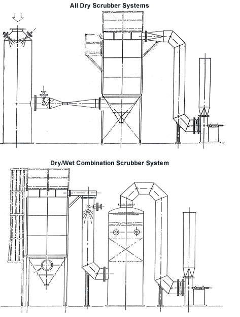 Bionomic Dri-Scrub™ Dry and Wet/Dry Combination Scrubber Systems are available for gas flows from 160 to 75,000 acfm, provide particulate collection efficiencies between 98 and 99.9%, and are normally used for scrubbing gas streams with fine particulate that can contain acid gases, mercury or NOx. Dry systems utilize a dry venturi scrubber for rapid mixing of the containment gas with hydrated lime or sodium bicarbonate reagents with or without carbon and are followed by a pulse jet fabric filter collector to capture solid particles – totally eliminating water and wastewater treatment or pollution. Dry/Wet systems utilize a pulse jet fabric filter for solid particulate capture, followed by a RotaBed® or packed tower scrubber for gas absorption. The system offers superior solid particulate collection and higher gas absorption efficiencies with less energy usage than wet scrubbers.