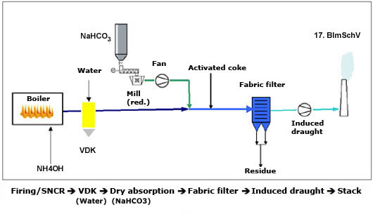 In the process of dry flue gas cleaning, the flue gas, if necessary, is moistened and cooled upstream of the actual reaction stage. This is done, on the one hand, for protecting the filter (temperature) and, on the other hand (if lime is used), for moistening the flue gas up to the dew point range. In order to bind the pollutants contained in the flue gas flow, such as hydrochloric acid (HCl), sulphur dioxide (SO2), organic pollutants (e.g., PCDD/-DF, PCB) as well as ecotoxic heavy metals (e.g., mercury), in the downstream reaction line sorbents, such as NaHCO3 or lime hydrates and hearth furnace cokes are a metered addition. The reaction products are efficiently separated by means of a downstream filter and recirculated, if necessary.