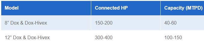 Installing a Dox ahead of an Expeller® doubles the capacity of the press, replaces expensive steam-heated cooking vessels, doubles the life of the pressing parts, and reduces meal oil residuals to under 6%. The oilseeds processed with this extruder are low oil content seed (less than 25% oil).
