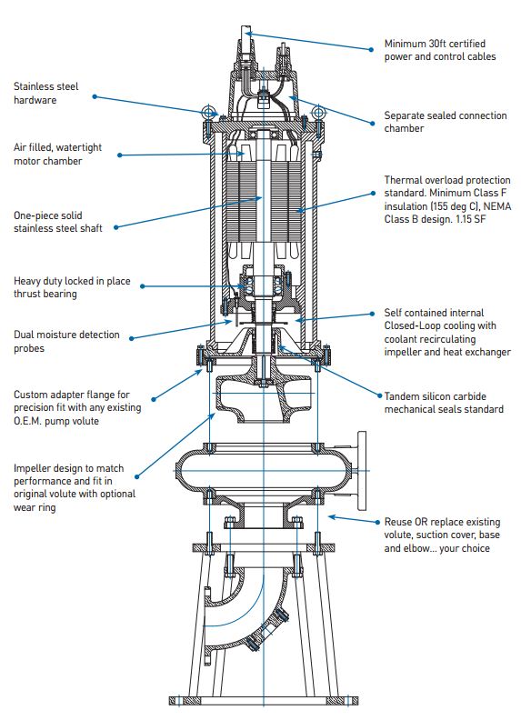 Direct “DROP-IN” replacements. NO piping changes. NO base or foundation modifications. Rotating assembly only. OR complete pump retrofit... your choice. Simple LOW COST installation. Eliminate flexible drive shafts. Full protection against station flooding. Impellers, volutes, suction covers, suction elbows and bases to match ALL major brands.