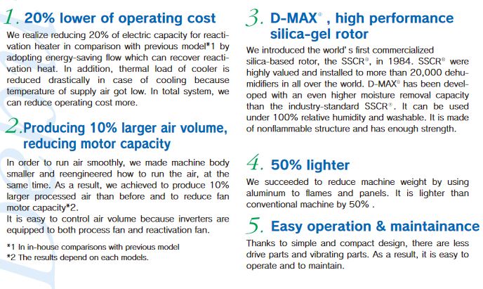 Using of our latest design, we succeeded in developing New-SGP dehumidier which is smaller, lighter and more energy-saving than a conventional SGP. "D-MAX ", which has been developed with our long experience, realizes high performance as well as excellent dehumidication for various needs of many industries.