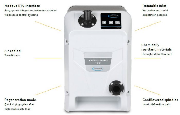 VACUU·PURE easily handles high vapor loads through its high condensate compatibility. A gas ballast is therefore not necessary. The integrated regeneration mode enables rapid drying of the pump after the end of the process and thus the sample throughput can be significantly increased, as compared to other pump technologies.