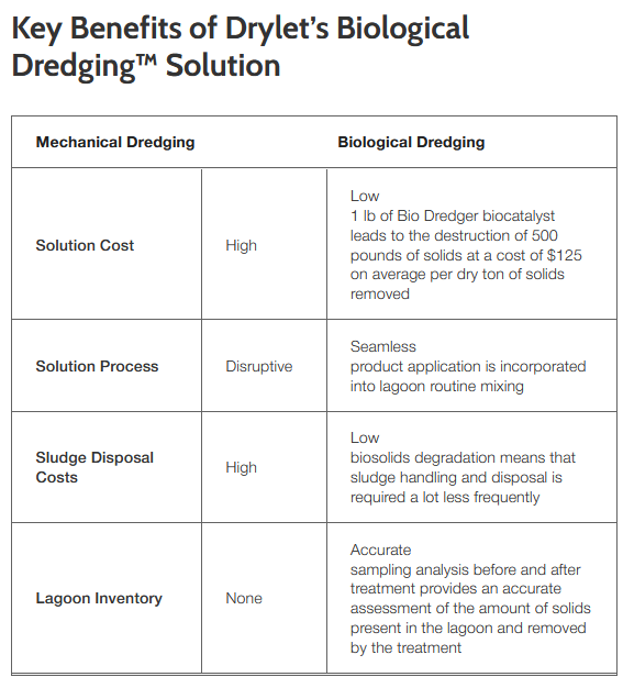 Microbes are the operating system of any wastewater treatment system, including lagoons. Turbo-charging their activity makes lagoon dredging inexpensive, easy, non-disruptive, and headache-free. In addition, it provides ongoing treatment, while reduced solids translate to significant environmental benefits.