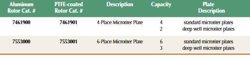 Depending on the rotor, made of anodized aluminum or PTFE-coated metal with polypropylene hub. Easily interchangeable. Microtiter Plates are not included. Shipping weight 2.5 lbs. (1.1 kg).