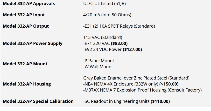 The Model 332-AP is specifically designed for pump control applications. The 332-AP has two channels, one for each pump, and provides a 3.5 digit bright red LED readout of the measured variable. The readout may be 0/100% or in engineering units as specified.