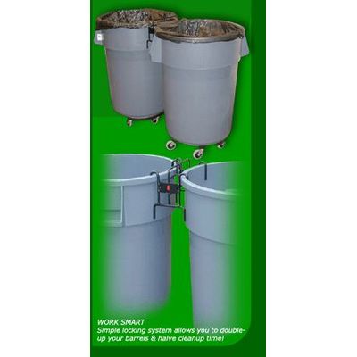Barrel Buddy allows users to quickly lock together two standard mobile barrels (44 gallon, Brute-style barrel with dolly) for the collection of trash and recycling or simply to double the trash hauled to the drop off point. The system maintains superior maneuverability in all directions, be it hard floor or carpeted surfaces. A half turn of the quick release lock and lift off to separate the barrels. No hassling with unstable barrels lashed together with liner bags or rope. Either barrel is free to be tilted for safe removal of a heavy bag or for single bin use.