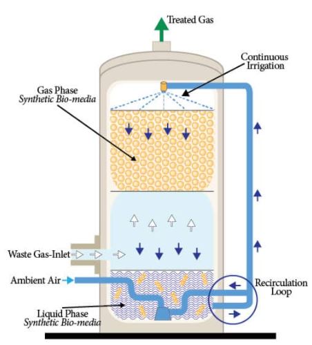 Pollutant compounds that dissolve in water are treated in the water phase while compounds that remain in the air are treated in the gas phase. The Dual-BioPhase™ Technology utilizes synthetic media on which contaminant degrading bacteria are immobilized as biofilm on the surface of the media. As air flows through the bed of media, the contaminant comes in contact with the active biofilm that degrades the pollutant compounds. At the same time, a continuous stream of water flows down through the media to keep the biofilms moist and biologically active.