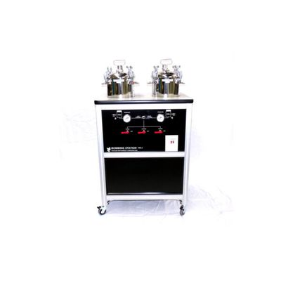 The purpose of the PBS-2 Bombing Station is to “bomb” hermetically sealed components prior to leak testing. Included in this system are two canisters (chambers) which may be pressurized to 100 psi. Max. Each of the two canisters may be operated independently thus allowing the operation to run sequentially, providing a constant flow of newly “bombed” parts. It also permits several devices to be prepared to varying specifications Operating controls provide for initial evacuation of the canisters (from 1 atm down to 30 in Hg max); backfill of helium (1 atm to 100 psi max) ; removal of helium after bombing and flushing of bombed parts with dry nitrogen (removes residual surface helium).