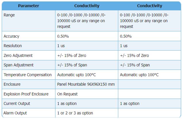 These instruments are menu driven. Auto calibration and standard self diagnostic features are incorporated. 2 Line 16 character alpha numeric backlit LCD for display. Channel 1 for Conductivity and channel 2 for conductivity. Range for each channel can be selected by menu. Two parameters will be simultaneously displayed. Independent current output for both channels (isolated 4-20 mA). Alarm can be configured. Ideally suitable for differential conductivity measurement.