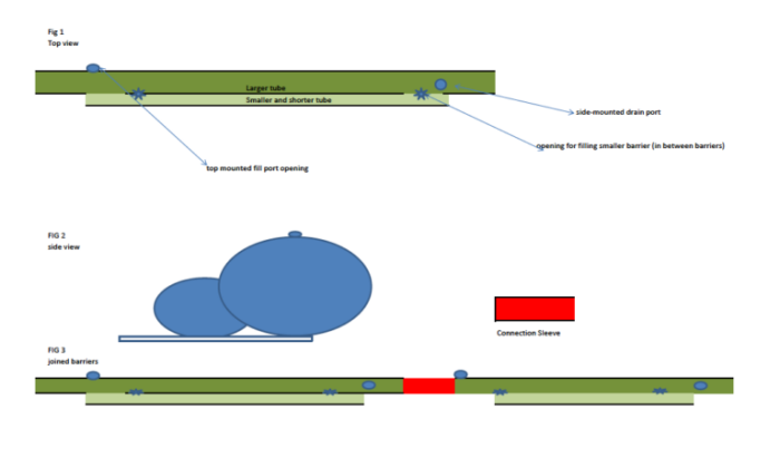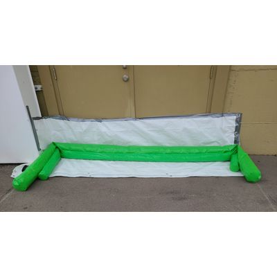For low level flood protection, RBS offer 5 1/2inch water inflatable dual barriers in 6 and 12 ½ ft lengths. These dual barriers resist rolling on elevations of up to approximately 22 degrees. The 6 ft lengths are designed for basement windows and doors and the longer 12 ½ ft lengths can protect sliding doors and single car garages. Sleeves are available to increase the length if necessary. These barriers are not designed to be stackable.