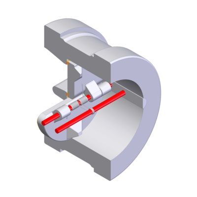 The stop pin is part of the trim. It is machined from ground bar in forged stainless steel. It is held in position parallel to the hinge pin on the same support. It has a double function: it stops the disc and retains the spring’s trust. The pin can be easily removed for maintenance of the valve.