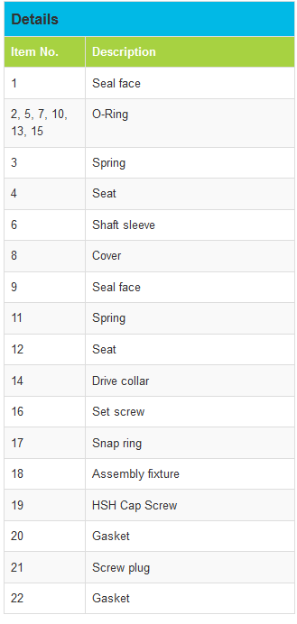 Dual seal configuration. Balanced design. Independent of direction of rotation. Cartridge construction. Available for standard (CTX-ASDN) and big bore (CTX-ABDN) seal chambers. Double pressure balanced. Designed with integrated pumping device for increased efficiency in circulation.