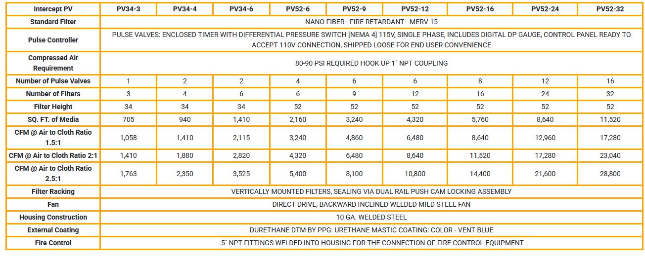 The Intercept PV-Series vertical cartridge dust collector can capture and remove most industrial dusts from manufacturing operations. A unique CAM-LOC cartridge locking mechanism securely seals the filter cartridge to the clean air plenum to prevent dust bypass and making filter changing a breeze. A variety of system configurations are available to accommodate space restrictions and application-specific requirements.
