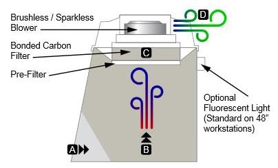 - Filter and electronics are located above the workspace, eliminating the chance of a chemical spill entering these sensitive areas