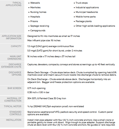 There is an overflow bypass opening ahead of the screening unit. The vertical bar screen has a .71 inch bar opening with other size options available. As screenings are captured, a discharge chute extends vertically to compact, dewater, lift, and store debris, without additional augers required. The solids are held in the chute or discharged into a bin, fully contained for odor control and aesthetics. Debris management is simple, with planned and infrequent pickups to dispose of solids.