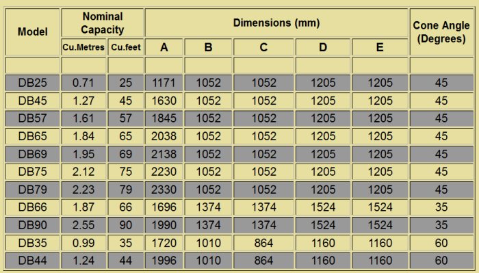 Capacities: 0.71-3.22 cubic metres/25-114 cubic feet