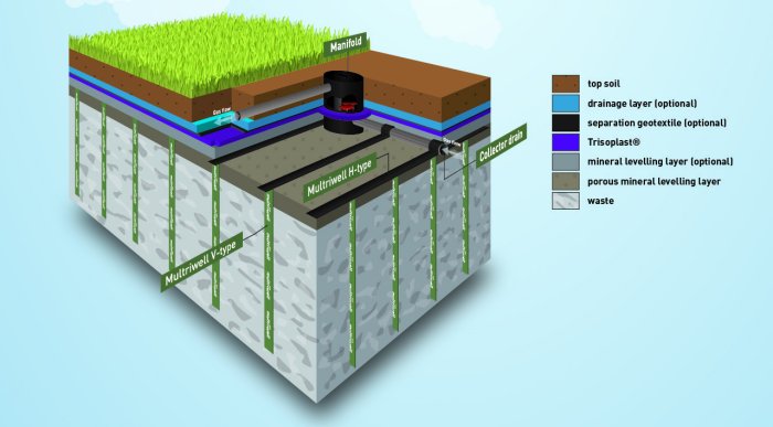 Multriwell is the new and effective solution for landfill gas extraction. This innovative technology enables landfill operators to extract considerably more gas compared to when traditional gas wells are used. The patented system consists of three components: short distance flexible vertical gas wells that are installed in very small grids, horizontal gas collection wells and an optional Trisoplast® or HDPE capping construction. By perforating the waste within very small grids also leachate layers will be perforated and spread more evenly through the waste and causes an enhanced bio-reaction, resulting in faster achievement of landfill inertia and settlement what generates a higher biogas production.
