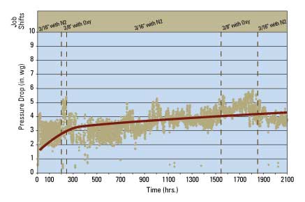 What about those job shifts of cutting typical 10 gauge sheet metal today and 1/4" plate tomorrow? No problem for versatile and flexible PowerCore filter packs cleaned by the channeled pulse energy of the ZERO-Turn Power Pulse Cleaning System. PowerCore filter packs recover more easily than traditional cartridge filters from dramatic spikes in pressure drop during pulse cleaning. The result is longer filter life.