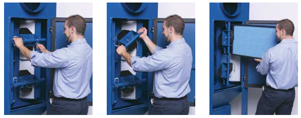 Torit PowerCore TG filter packs are easy to remove and install. No tools required. Better yet, it takes only one person to do the job. Just open the T-Handles on the front access door and open the proprietary rotary filter locks to get instant access to the filter packs. PowerCore filter packs are lightweight and remain below the 50-pound OSHA Lift Limit even at the end of their life cycle.