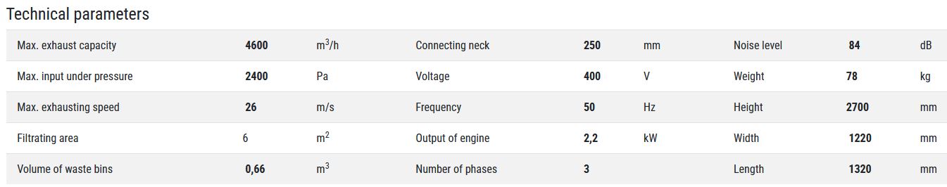 Robust full metal construction with welded rotor which was developed with requirement for long term durability also in the case of extraction of small pieces of wood and knots. High reliable extractor with significant utility value and good output. Suitable construction form ensures easy location in each workshop.