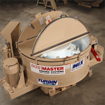 The Turbin pan-style mixer manufactured by DustMASTER has been an industry standard for more than 70 years, legendary for the speed and quality of its mixing. With a capability of 20 to 250 tons/hour, it is suitable for processing a range of abrasive and difficult-to-mix materials. Unique concave mixing paddles and three-dimensional mixing action are keys to the Turbin’s performance. With paddles covering 600 feet per minute tip speed, the mixing action generates excellent dispersion and turns materials into a homogeneous, 100% stabilized mix. Dependent upon the type of material, the Turbin can produce a non-dusting mix in only 30 seconds with as little as 8% water (or another reagent). Two Turbin models in each of the sizes are available: DustMASTER Series I with a weigh batcher; and DustMASTER Series II with load cells under the mixer.