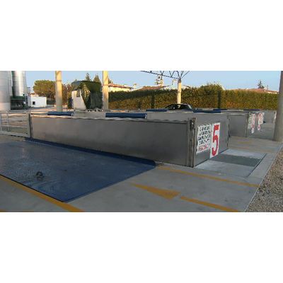 One side, two sides and rear tipping. Frame consisting of longitudinal lateral UNP type profiles and central IPE beams. Corrugated sheets for the walking surface. Inspection port. Chains with lifting hooks and shortening hooks for securing vehicles. Accident prevention protections pursuant to law.