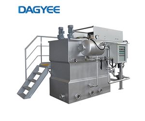 DAF dissolved air flotation consists of flotation tank, dissolved air system, reflux pipe, dissolved air released system, skimmer (Based on customer needs, there are combined type, traveling type and chain-plate type to choose.), electric cabinet and so on. Air flotation separation technology of DAGYEE DAF dissolved air flotation dissolved air into water at certain working pressure. In the process, pressurized water is saturated with dissolved air and is discharged into a flotation vessel. The microscopic air bubbles produced by released air attach to suspended solids and float them to the surface, forming a sludge blanket. A scoop removes the thickened sludge. Finally, it complete purifies the water.Dissolved Air Flotation Description