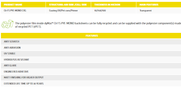 dyMat® transparent frontsheets are the ideal solution to be employed instead of glass in lightweight flexible photovoltaics. They combine the properties of a co-extruded polyester film with those of a special UV coating applied in a high-tech EB curing production process. dyMat® frontsheets have been specifically developed to guarantee an extra high UV and hydrolysis resistance together with outstanding anti-scratch and anti-abrasion properties. dyMat® Clr FS PYE MONO CXG is a monolayer Pet based product for 1000 VDC . It can be supplied with the UV coating in a matt anti-glare finish for output enhancement.