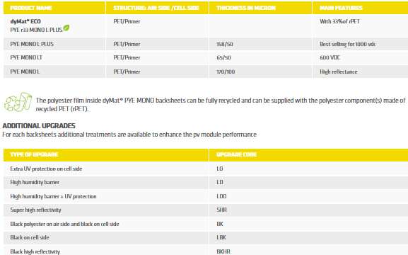 This new generation of backsheet from Coveme is based on a single PET layer (Mono Layer) that features superior resistance to UV and hydrolysis thanks to its bulk technology. Contrarily to the co-extrusion technology, the bulk technology features the UV protection all across the whole thickness of the single PET layer. Coveme’s monolayer backsheet shows excellent performances in the combined UV+DHT tests as well as it features an intrinsic high reflectivity. The range also includes a version of the revolutionary dyMat® ECO range composed of 33% recycled polyester (rPET) coming from post-consumer waste recycling. dyMat® ECO PYE r33 MONO L PLUS is the very first backsheet made with rPET availabe on the market today.