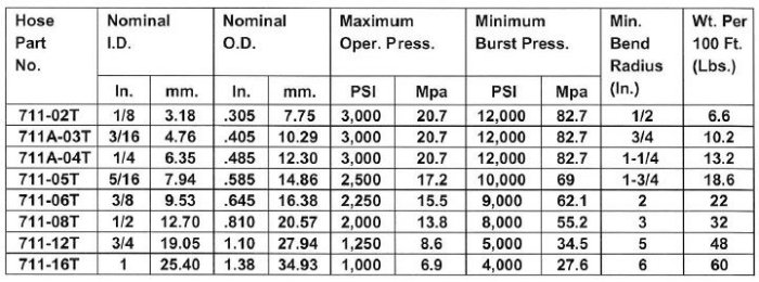 Recommended For: Medium pressure hydraulic and pneumatic systems. Meets or exceeds SAE 100R7 requirements. For pneumatic or gaseous systems, use perforated (pin-pricked) hose. Inner Core: Oil resistant synthetic polyester tube. Reinforcement: Braided high tensile synthetic fiber. Cover: Black high abrasion resistant polyurethane. Temperature Range: -40 degrees F. to +212 degrees F. (-40 degrees C. to +100 degrees C.).