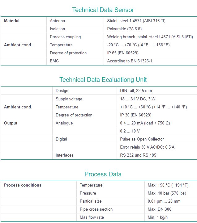The measurement principle of the DYNA M-flow is based on the physical Doppler-Effect, whereas the sensor generates a uniform field in the microwave frequency range inside the pipeline. These microwaves are being reflected by particles passing through the pipe. Calculation of frequency and amplitude changes allows an accurate determination of the solid's mass flow rate. Nonmoving particles like dust accumulation are excluded from calculations.
