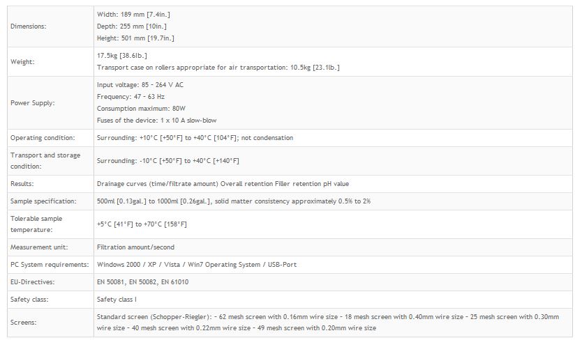 • balance, 5 screens of different wire sizes, Stirrer for retention measurement, Stirrer for drainage measurement, Outlet valve for retention measurement, Filtrate outlet for drainage measurement, PC Software