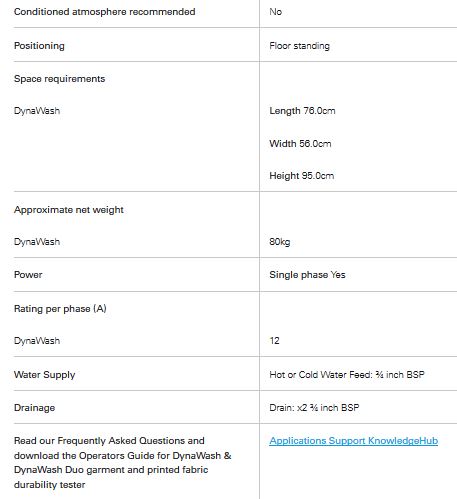 A range of textile testing can be performed in the DynaWash, including print durability, pleat retention, cockling, flock retention, crinkling, differential shrinkage and security of attachments, plus many others.