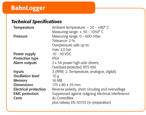 The Bahnlogger fulfills the needs and requirements of the rail vehicle industry as a reliable, innovative and high-performance product. In these cases of need, it is primarily about compensating for varying load spectra by the different rail vehicles. In the range of application of the rail transport, the loads due to acceleration, pressures, forces, strong vibration and acoustic noise to consider, which the Bahnlogger completely fulfills and ensures. Plug connections and module casing are designed and tested for these conditions.