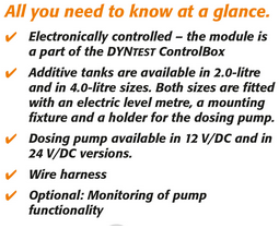 The DYNTEST-Module LiquiCat®, which is an add-on module that works together with the ControlBox (ECU) provides perfect control of the regeneration process. Once fitted, its sensors are integrated in your tried and tested DYNTEST bus system, and it will control the dosing of the additives. If a critical value is reached, the LiquiCat® will trigger audible and visible alarm signals. The dosing module is easy to program, and can be set to meet a wide range of operating requirements.