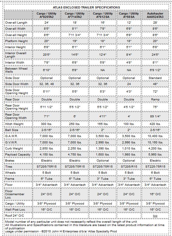 • Axle & Tire: Spring Idler Axle w/4" drop, (electric brakes included on 7` wide & larger, 15" white Mod wheels), 15" sure trail bias tires.