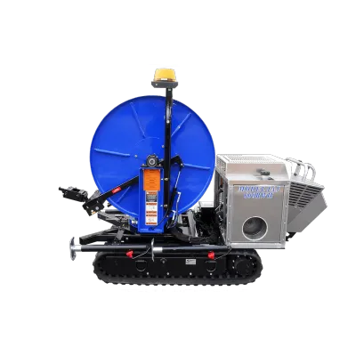 The Model JAJ-600WH Easement Machine is specifically designed to facilitate the maintenance of sewer systems in areas that are difficult to access. It significantly enhances the reach of standard sewer jetting trucks by extending it by 500 feet or more, thus aiding in the reduction of sewer overflows. Powered by Honda V-twin engines on hydrostatically powered tread drive platforms, the JAJ-600WH eliminates the need for drive chains and sprockets, ensuring cleaner and quieter operation. The rubber tracks provide optimal weight distribution and limit ground pressure to only four pounds per square inch, comparable to golf course maintenance equipment standards. The machine is engineered to fit through standard 36” gates and offers exceptional lateral stability off-road with hydraulically extendable tracks ranging from 34” to 46”. Standard features include dual joystick skid steering control, a 180-degree rotating safety hose reel, a safety pressure relief valve, and a hydraulic tool circuit capable of powering bypass pumps and hydraulic saws. Optional enhancements include automatic level wind with hydraulic up/down action, safety and work lights, and a tandem transport trailer.Are certain sewer pipes in your community neglected due to hard to reach manholes? Do your maintenance crews have to manually drag hoses across easements or cause damage to yard, golf courses, or environmentally sensitive areas when trying to service these remote lines?